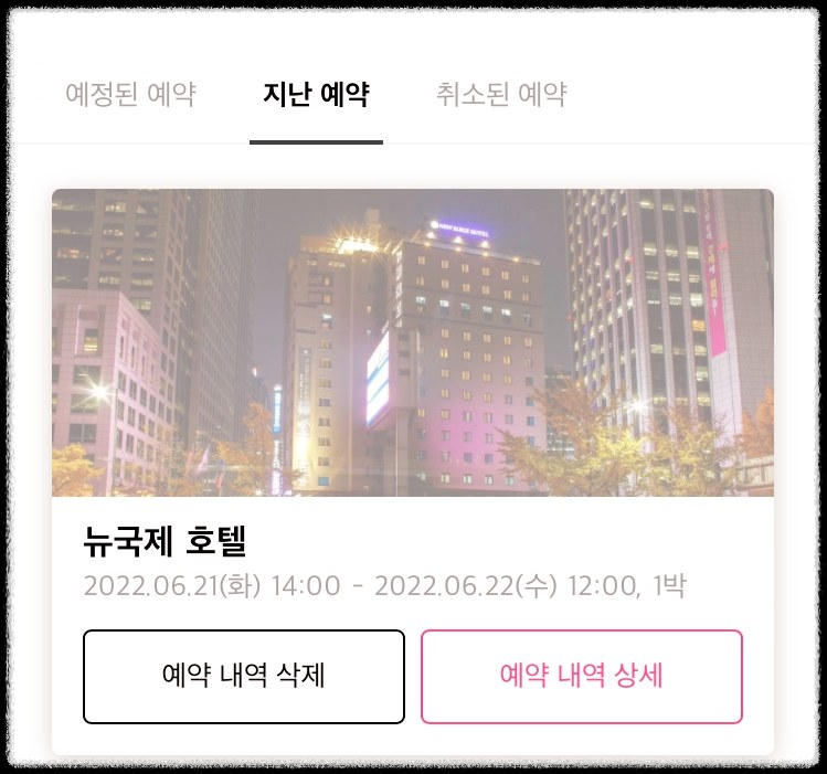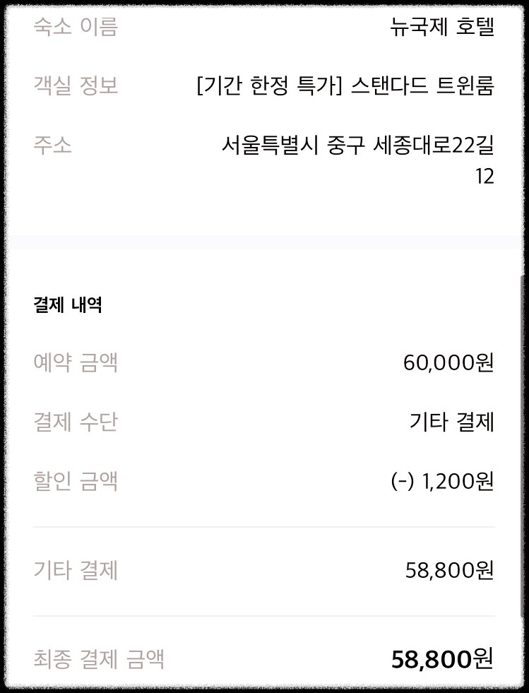 이번 서울 여행 목적은 딱 하나, '돈까스 맛집 탐방'이었다. 그래서 숙소를 고를 때 '식당과 가까운 위치' '합리적인 가격'을 고려해서 선택하였다. 내가 가려고 한 맛집은 '오제제'라는 곳인데 지난 글에서 후기도 남겼다. 그리고 지금 글 쓰는 뉴 국제호텔은 이 식당과 1분도 안 되는 거리에 있었다. 이름에서부터 느껴지듯 약간 올드함과 딱딱함과 동시에 약간의 품격이 느껴진다. 예약은 '야놀자 앱'을 통해 6만 원에 결재를 했다.