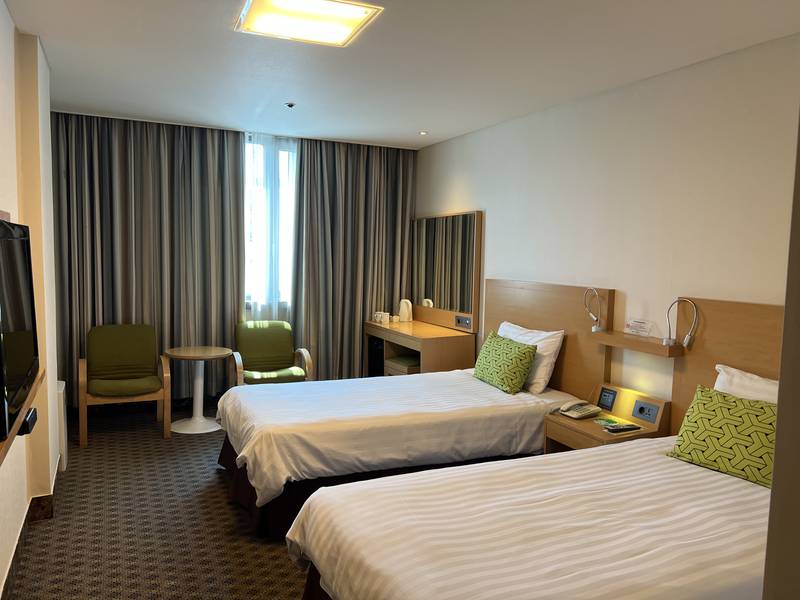 침대 매트리스 상태는 꽤 좋았다. 이불 커버 또한 잘 세탁되었고 교체도 잘 된 것 같음. 한 가지 살짝 아쉬운 건 베개였는데 침대당 베개가 2개씩 있었다. 둘 중 하나가 초록색 커버가 씌워져 있는데 이 부분이 아쉬웠다. 이불 커버, 베개커버는 모두 같은 색, 재질이기 때문에 대용량으로 한 번에 세탁할 수 있다. 하지만 이렇게 색깔, 재질이 다른 커버는 따로 빨아야 한다. 비효율적이기 때문에 세탁이 잘 되고 있는지 의문. 그리고 이렇게 색이 다른 베개는 손님들이 다리받침으로 많이 쓴다(숙박업 해봐서 암). 별거 아닌 베개를 트집 잡고 글 숫자를 채워야 할 정도로 객실 컨디션이 잘 관리되었다는 말이다.
