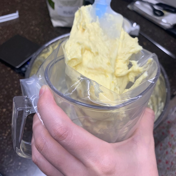 5. 반죽을 짜는 주머니에 넣고 냉장고에 넣어두었던 파운드케이크 틀을 꺼내 적당히 나눠서 넣어준다. 주걱으로 틀에 담긴 반죽을 살살 정리해주는데 이때 바깥쪽면을 높게, 가운게 부분을 낮게 해야 구웠을 때 예쁘게 나온다. (아래 사진 참조) 짜는 주머니가 없으면 그냥 반죽을 주걱으로 담아도 됨!