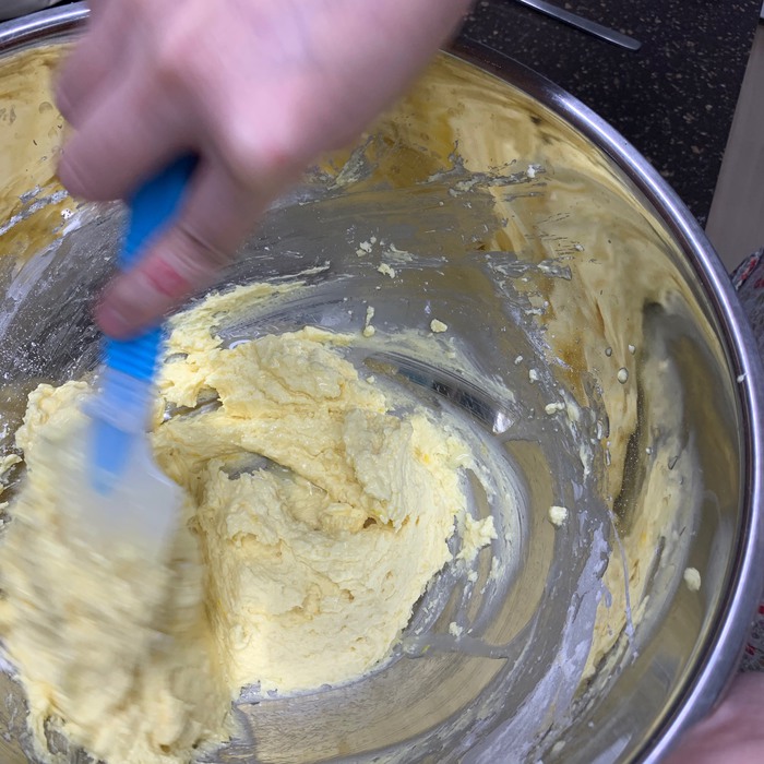 3. 아까 만들었던 버터 반죽에 계란을 6~8번 정도 나누면서 핸드믹서로 섞어준다. 중간에 깔끔이 주걱으로 반죽을 정리해주면 좋다.